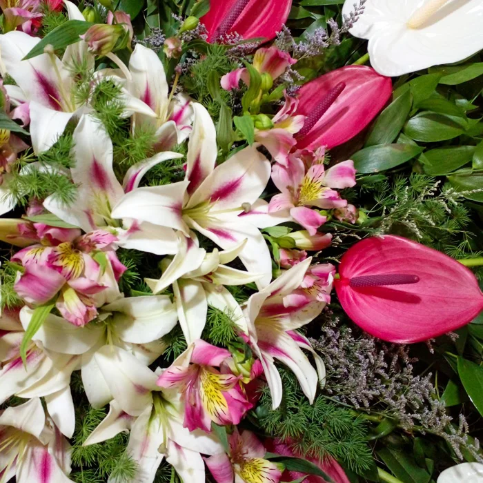 این محصول زیبا از گلهایی مانند : آنتوریوم سفید ، آنتوریم صورتی و لیلیوم و آلستر صورتی تشکیل شده است که در کنار پالم های زیبا ترکیب متفاوت و جذابی را بوجود آورده اند.