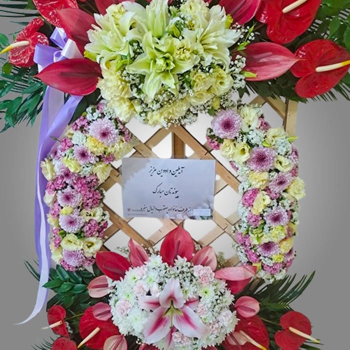 در این کار زیبا از گلهای بسیاری اسفاده شده است که برخی از آنها را برای شما عزیزان معرفی خواهیم کرد. این گلها عباتند از : آنتوریوم قرمز – آنتوریوم قاشقی صورتی – لیلیوم سفید – اورینتال فرونترا – داوودی صورتی – لیسینتوس کرم – داوودی سفید – زنبوری سفید – ژیپسوفیلا – قلمفور سفید – قلمفور صورتی – برگ سیکاس – برگ بامبو که به صورت بسیار زیبا در کنار یکدیگر قرار گرفته اند و این تاج گل زیبا را تشکیل داده اند.