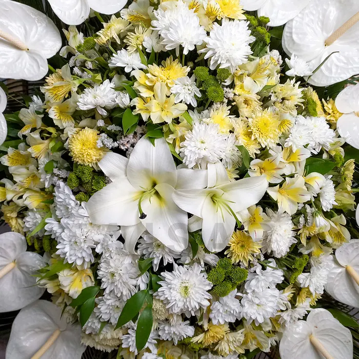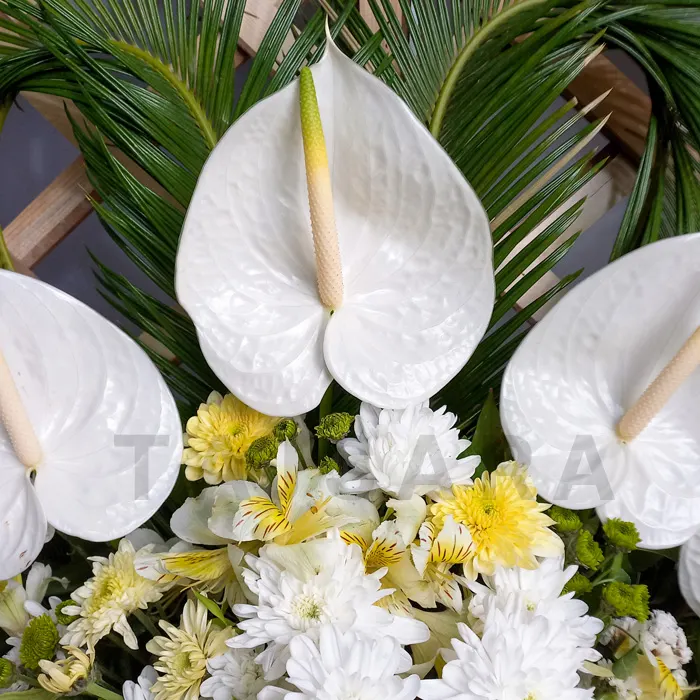 - گل انتریوم سفید: این گل با برگهای براق و شکل خاص خود، جلوهای لوکس و آرامشبخش به تاج گل میبخشد. انتریوم سفید نمادی از احترام و صلح است و حضور آن در مراسم ترحیم، حس آرامش و یادآوری محبت را منتقل میکند.